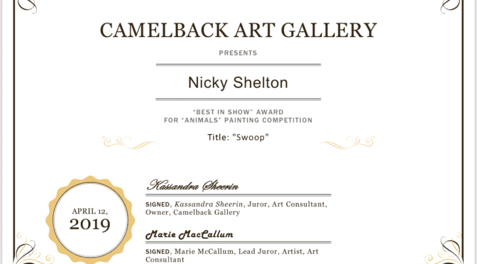 “Swoop” my bird painting of an Australian Magpie takes pride of honor – Jury selected “Best in Show” by the USA based Camelback Gallery “Animal” one line painting competition. “Swoop” was lovingly painted in memory of my father who lost his battle with Parkinson’s disease. When asked what bird would he like me [ more info ]