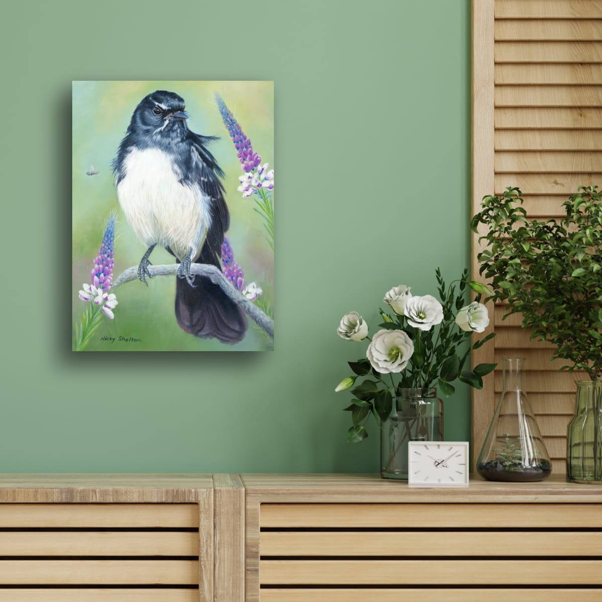 My oil painting called “Chitty Chitty” is of a male Willy Wagtail. He is distinctive by his white eyebrow which is not just a fashion statement – it helps him attract a mate.