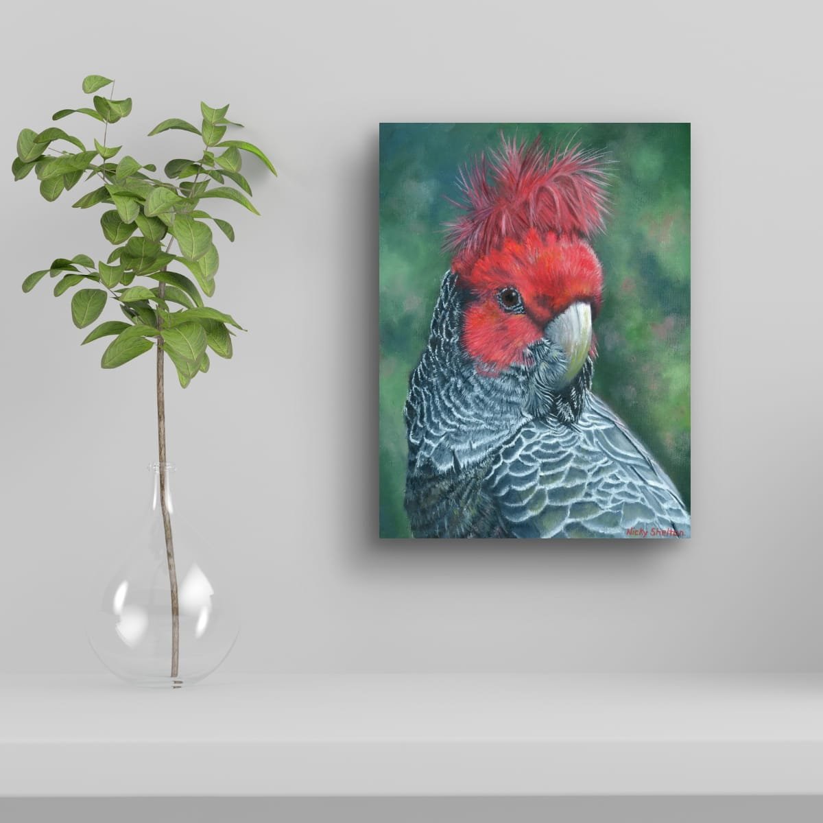 I love the distinctive wispy curly crests and stunning feather patterns of these beautiful Cockatoos. The Gang-gang Cockatoo is a small cockatoo. The handsome male is easily distinguishable by his quirky crimson curly crest which looks like a feather duster. His crimson crest has awarded him the nicknames of Red-headed or Red-Crowned Cockatoo.