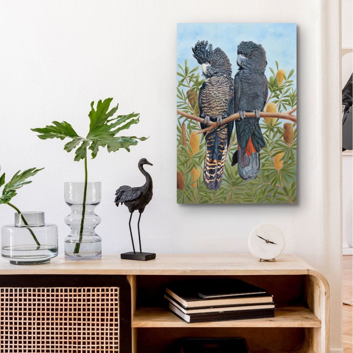 Meet “Kindred Spirits”—a piece that brings the vibrant beauty of a pair of  Australian Red-tailed Black Cockatoos to life. These stunning birds are perched gracefully among the coastal banksia trees, showcasing their striking colours and unique charm.