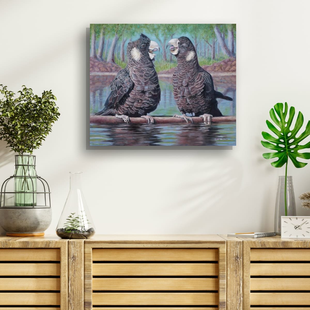 Painted in oils this captivating artwork features a pair of Baudin’s Black Cockatoos, perched gracefully on a branch above tranquil waters. Their expressive faces and intricate feather patterns reveal a moment of lively conversation, inviting viewers to appreciate the charm and personality of these remarkable birds. The serene reflection in the water adds depth, enhancing the connection between nature and art.