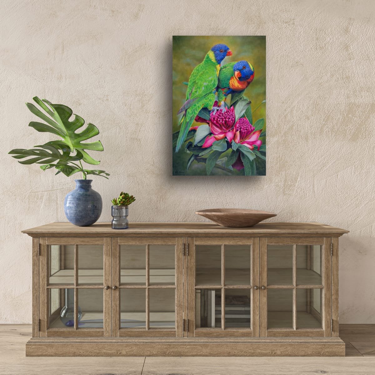 “Waratah” is an oil painting depicting a pair of beautiful Lorikeets sitting on one of Australia’s most iconic flowers, the floral emblem for New South Wales – truly a sight to behold.